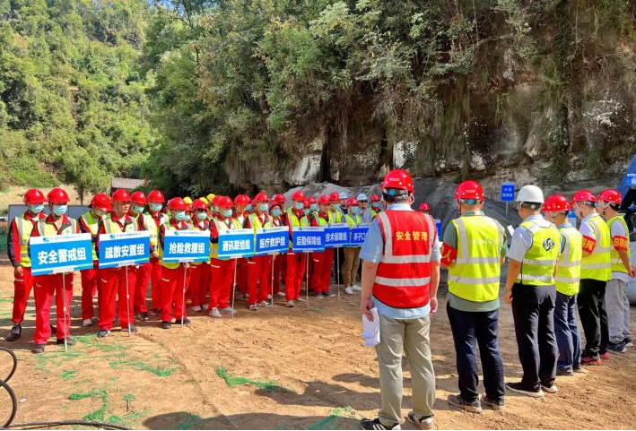 此次演练主要有演练动员、现场演练、演练总结三个环节,包含了应急预案启动、人员疏散、机械撤离、隧洞洞口封堵等四个场景。