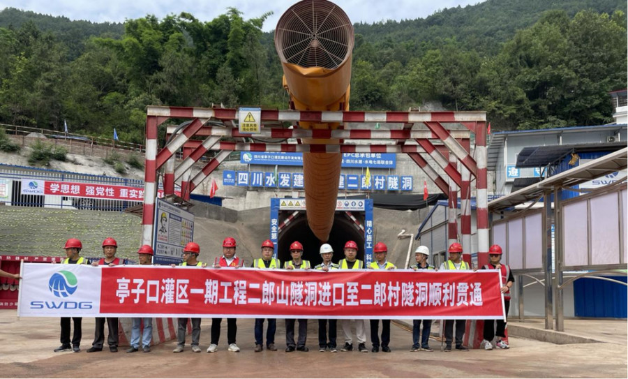 二郎山隧洞是EPC第Ⅰ标次关键线路,是亭子口一期工程第三长、Ⅰ标第二长隧洞,共设置3条施工支洞。由水发设计公司牵头,水发建设公司负责施工。隧洞总长8140.7m,其中进口至第1条施工支洞——二郎村分水洞共1.6km。进口工作面与二郎村分水洞分别于2022年11月14日和2023年4月4日开始主洞施工,双向掘进,月均进尺212m,历时7.5个月完成。施工前,总承包牵头设计与施工充分论证,优化分水洞设计,成功避让地质灾害区。施工过程中牢牢把握“红层”地区地下洞室水平岩层,薄层易掉块的特点针对性的开展质量与安全管理工作。