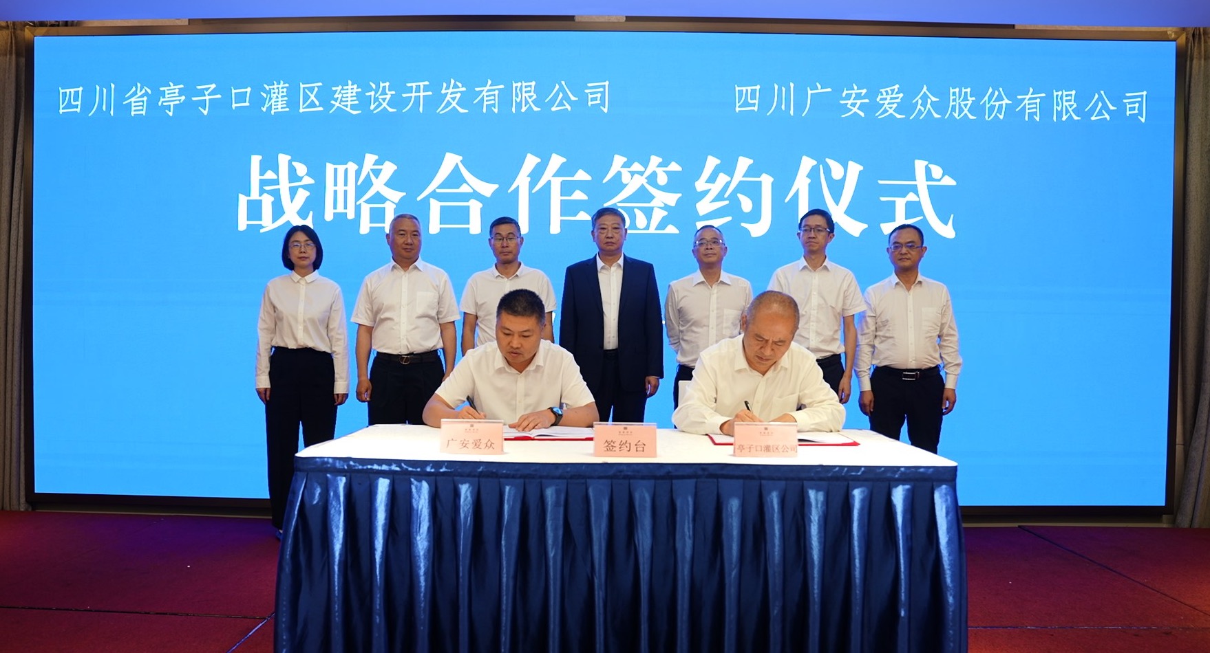 10月18日,四川省亭子口灌区建设开发有限公司与四川广安爱众股份有限公司战略合作签约仪式在广安富盈酒店举行。省水发集团董事罗国书,广安爱众公司党委书记、董事长余正军,党委副书记、总经理何腊元;亭子口灌区公司党委书记、董事长廖建强,党委副书记、副董事长、总经理文祥明出席仪式。