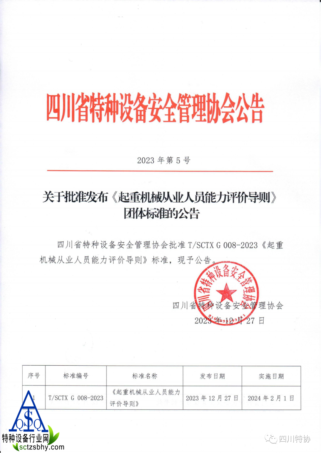 据四川省特种设备安全管理协会消息,《起重机械从业人员能力评价导则》(标准编号T/SCTX G 008-2023)于2023年12月27日发布,将于2024年2月1日起施行。
