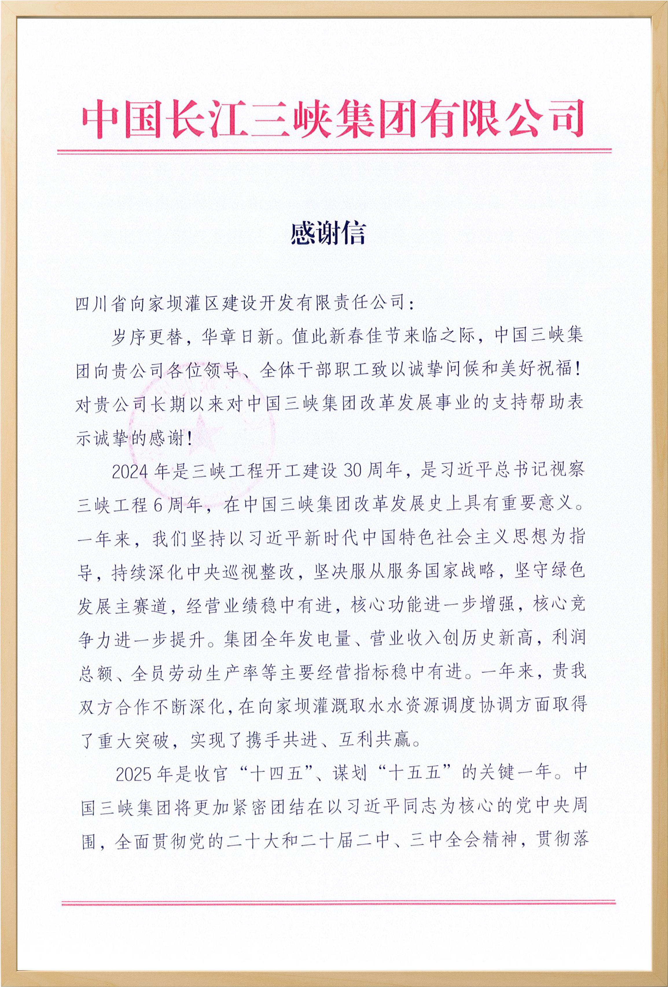 近日,向家坝公司收到了来自中国三峡集团的感谢信。在信中,中国三峡集团对向家坝公司在过去一年中的支持与合作表示了诚挚的感谢,并对双方取得的合作成果给予了高度评价。