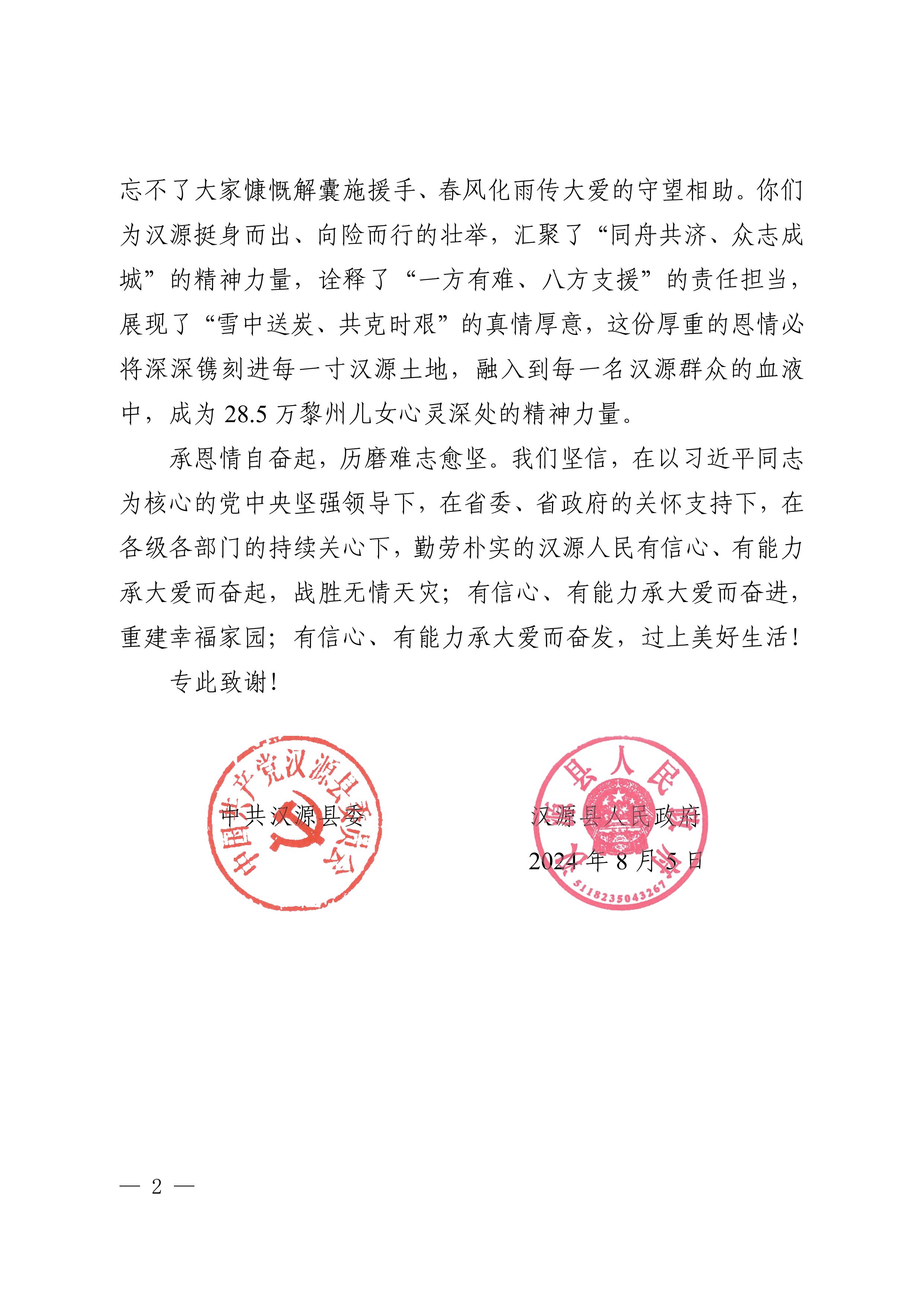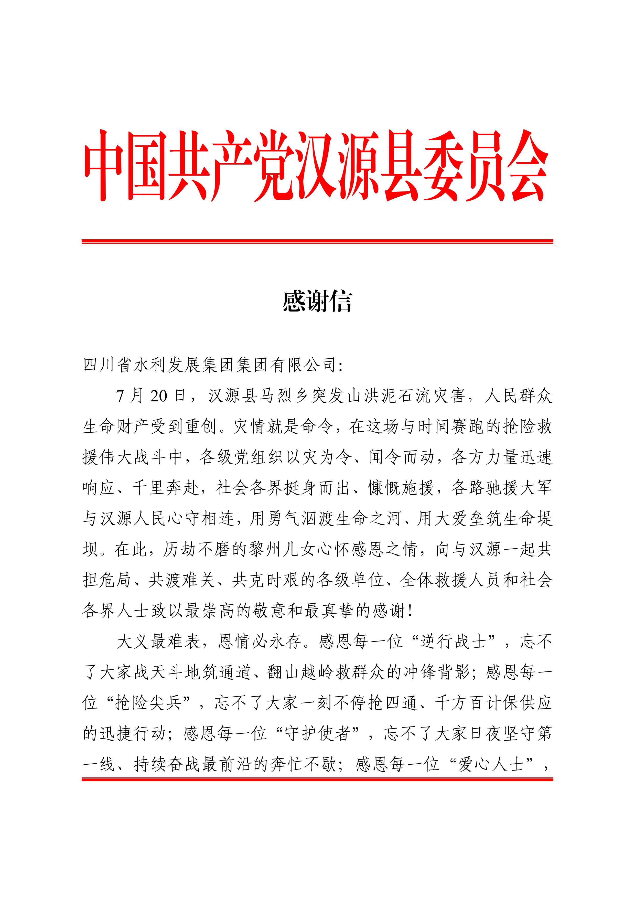 日前,集团收到来自中共汉源县委、汉源县人民政府的感谢信,信中对集团在“7•20”汉源县马烈乡突发山洪泥石流灾害应急抢险救灾中迅速响应、行动有力表示了衷心的感谢,对抢险人员的日夜坚守和全力以赴表达了崇高的敬意。