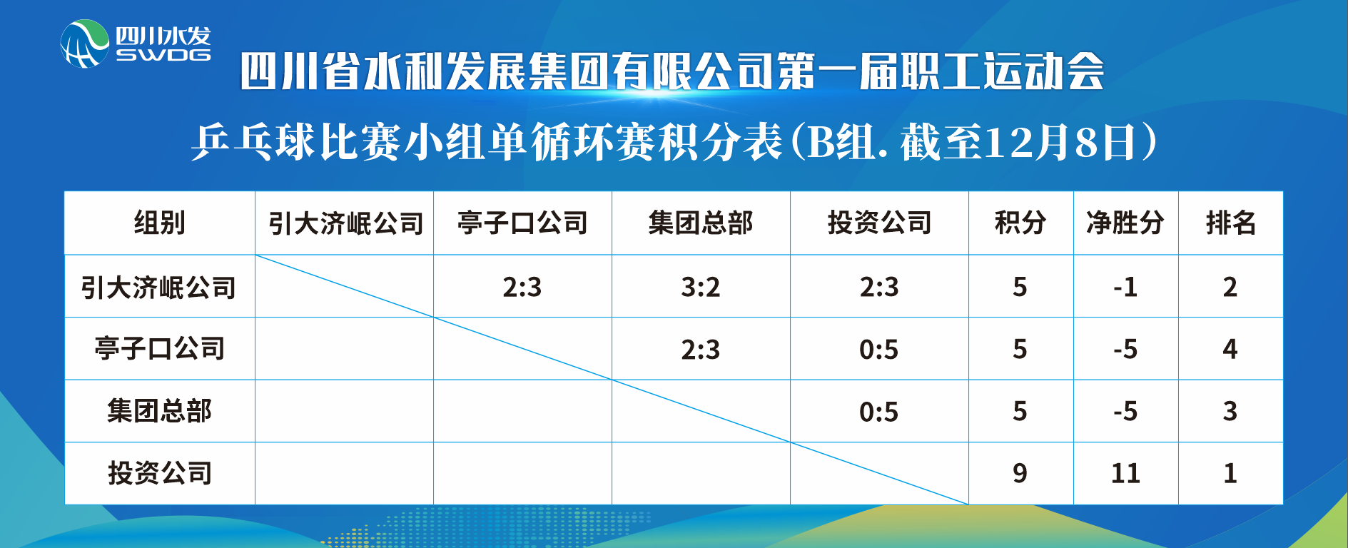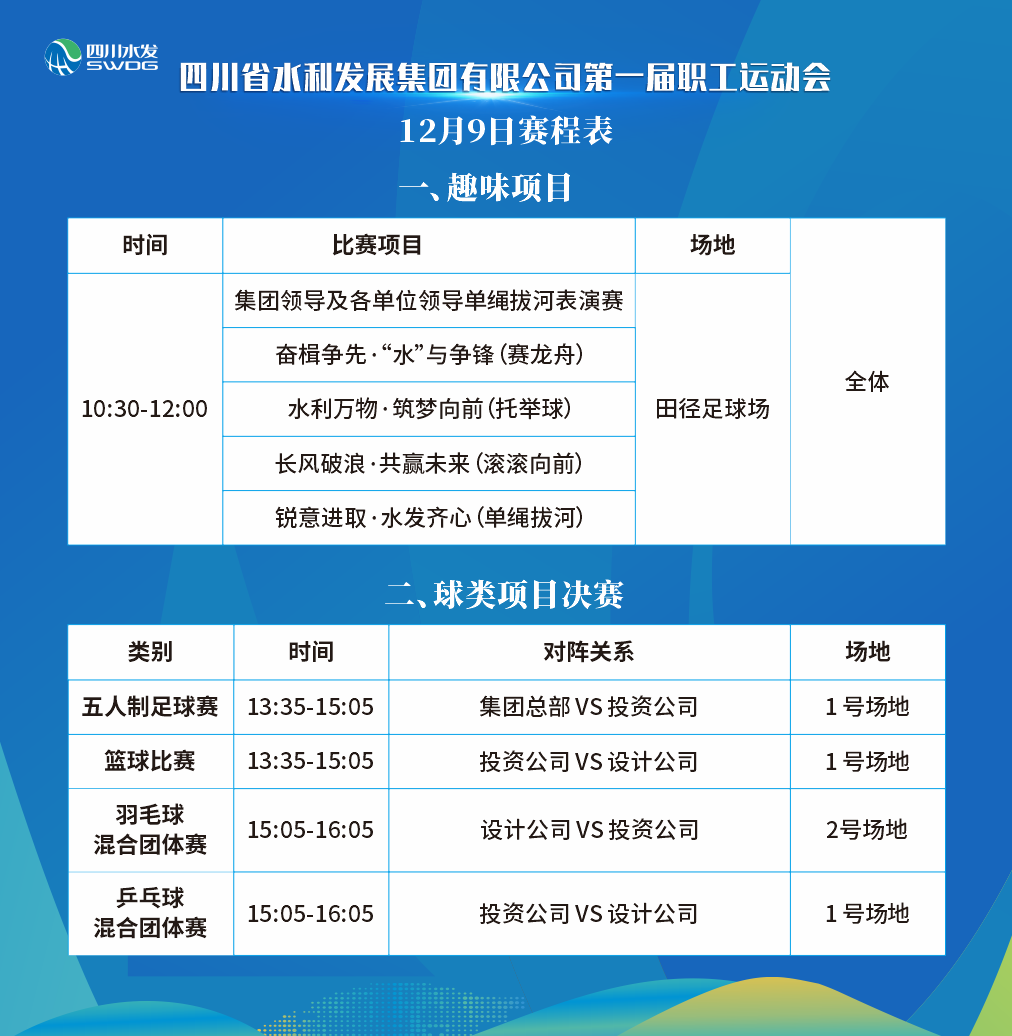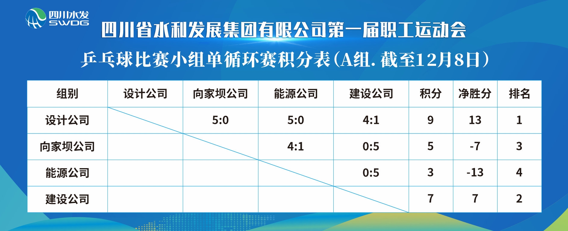 自12月5日运动会开赛至今,水发集团首届职工运动会第一阶段的小组循环赛已全部结束。积分榜上,8支队伍积分你追我赶。最终进入决赛的队伍分别是篮球(投资公司 VS 设计公司),乒乓球(投资公司 VS 设计公司),足球(集团总部 VS 投资公司),羽毛球(投资公司 VS 设计公司)。