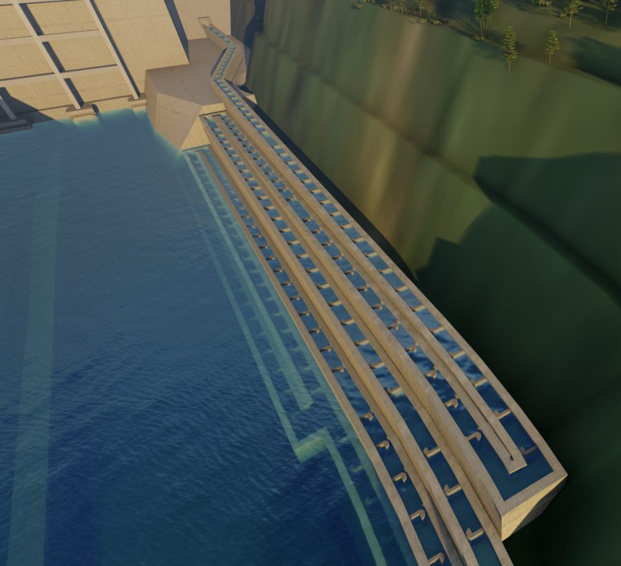 黄石盘水库鱼道工程采用了一种能够适应库水位变幅的升鱼塔结构,该结构已获得国家实用新型专利。升鱼塔结构采用升船机的原理,自动控制升鱼塔内水位的自由升降,实现升鱼塔内水位与上游水库任意水位衔接,达到了鱼类通过升鱼塔自由进入上游水库的目的。