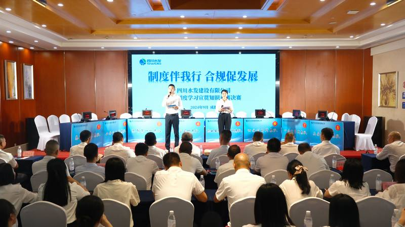 2024年是公司制度宣贯执行年,现代企业的发展离不开制度建设,制度有效性的关键在于执行。为赋能干部职工专业水平及合规意识的综合增长,持续推动公司现代企业治理体系建设,水发集团建设公司工会举办“制度伴我行合规促发展”内控制度学习宣贯知识竞赛。9月29日,决赛在成都成功举办,以良好的精神风貌为新中国75周年华诞献上最诚挚的祝福。7月启动知识竞赛活动以来,通过激烈紧张的角逐选拔,来自6个分(子)公司及公司总部的8支参赛队伍共24名参赛选手站上了决赛舞台。