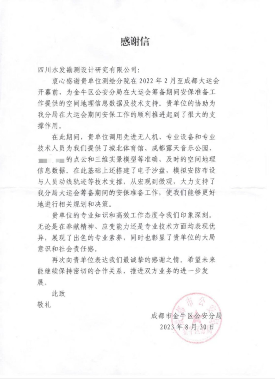 信中指出,设计公司测绘分院在大运会筹备期间所展现出的专业知识和高效的工作态度令金牛区公安分局印象深刻,无论是在奉献精神、应变能力还是专业技术方面均表现优异,展现了出色的专业素养,同时也彰显了设计公司的大局意识和社会责任感。