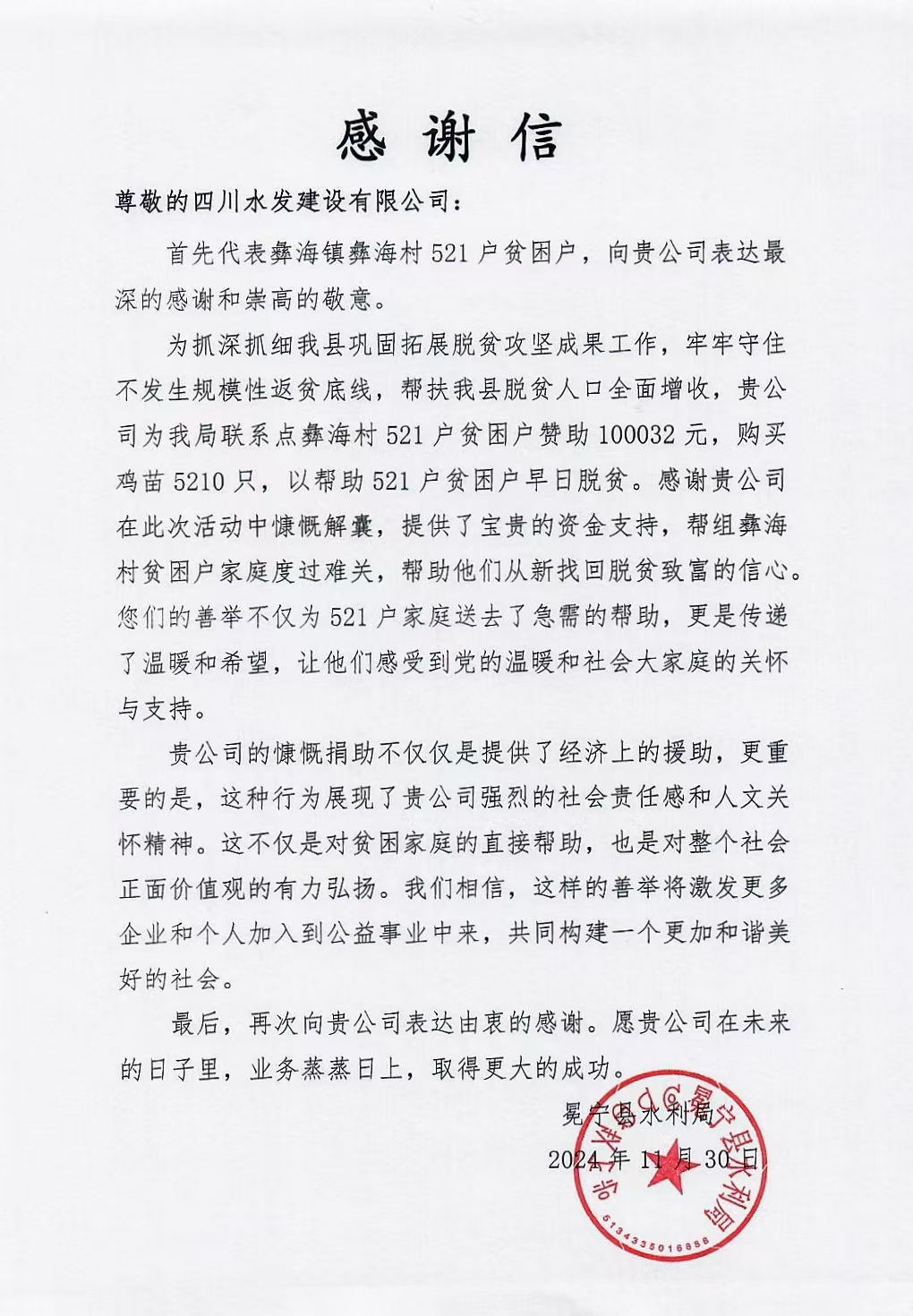 近日,建设公司收到了来自凉山州冕宁县水利局的感谢信,凉山州冕宁县水利局对建设公司在冕宁县彝海镇彝海村开展的系列帮扶举措表示感谢。