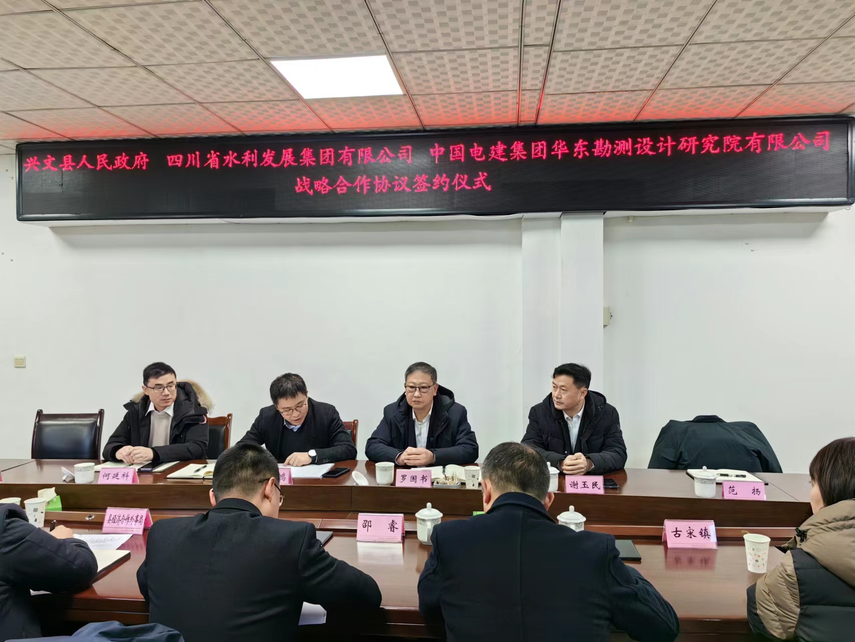 集团项目前期工作部负责人谢玉民、经营管理部相关工作人员,兴文县领导江北春、戴林冲,中电建华东院西南区域总部何延科、郭荣利参加了签约仪式。