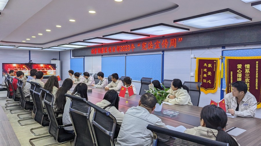各下属企业结合自身实际,聚焦宣传引导,利用公司门户网站、微信公众号专栏、电子显示屏等宣传阵地,推送普法文章,营造浓厚宣传氛围;聚焦思想引领,注重发挥领导带头示范作用,亭子口公司组织开展“宪法宣传周”学习会,引大济岷公司通过总经理办公会会前学法,大力加强宪法学习,强化宪法意识,弘扬宪法精神;聚焦基层一线,向家坝公司在项目建设工地张贴宣传海报,组织观看宪法宣传片,亭子口公司结合主题党日活动,在项目一线进行“弘扬法治精神 助力灌区建设”普法宣教,推动宪法精神深入项目一线,扩大辐射效应。