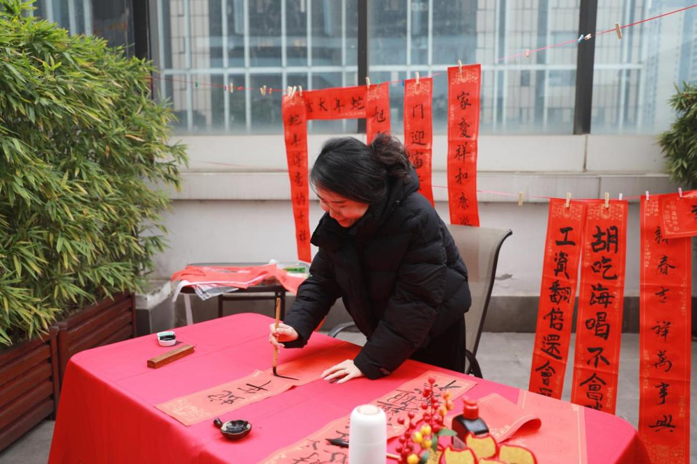 “迎春写对联”随着职工书写的铺毡、蘸墨、挥毫,笔锋一起一落,一幅幅对仗工整、寓意吉祥的春联跃然纸上。